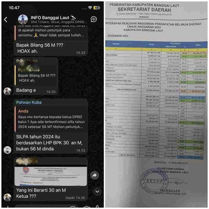 Kini menjadi sorotan tajam menyusul adanya disparitas signifikan antara laporan resmi realisasi Anggaran Pendapatan dan Belanja Daerah (APBD) dengan pernyataan Ketua Dewan Perwakilan Rakyat Daerah (DPRD) Kabupaten Banggai Laut terkait karena ditemukan perbedaan angka yang mencolok.