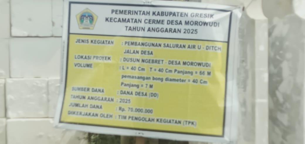 Gresik || Gemparnews.id – Proyek pembangunan saluran air U-Ditch di Dusun Ngebret, Desa Morowudi, Kecamatan Cerme, yang bersumber dari Dana Desa (DD) Tahun Anggaran 2025, kini resmi menjadi sorotan tajam publik. Papan proyek yang terpasang mencatat pekerjaan pemasangan saluran U-Ditch berukuran 40×40 cm sepanjang 64 meter, ditambah boong berdiameter 40 cm sepanjang 7 meter, dengan nilai anggaran mencapai Rp 70 juta.