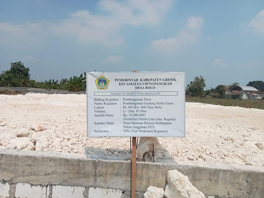 Sebuah papan proyek berdiri tegak di atas tanah kapur Desa Bolo, Kecamatan Ujungpangkah, Kabupaten Gresik. Di sana tertulis dengan gagah, “Pembangunan Gedung Serba Guna”, Dana Bantuan Khusus (BK) Kabupaten Tahun Anggaran 2025 sebesar Rp 95 juta, dengan volume L=20 meter dan P=50 meter. Pelaksana tertulis TPK Desa Bolo.