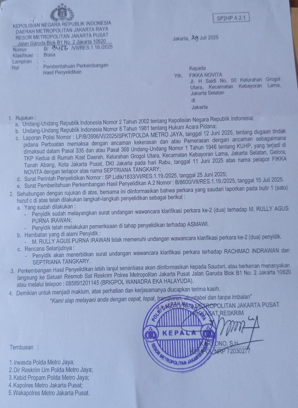 Proses penyelidikan yang dilakukan oleh Kepolisian Resor Metropolitan Jakarta Pusat mulai menemukan titik terang. Surat perkembangan hasil penyelidikan menyebutkan nama Septriana Tangkary sebagai terduga pelaku.
