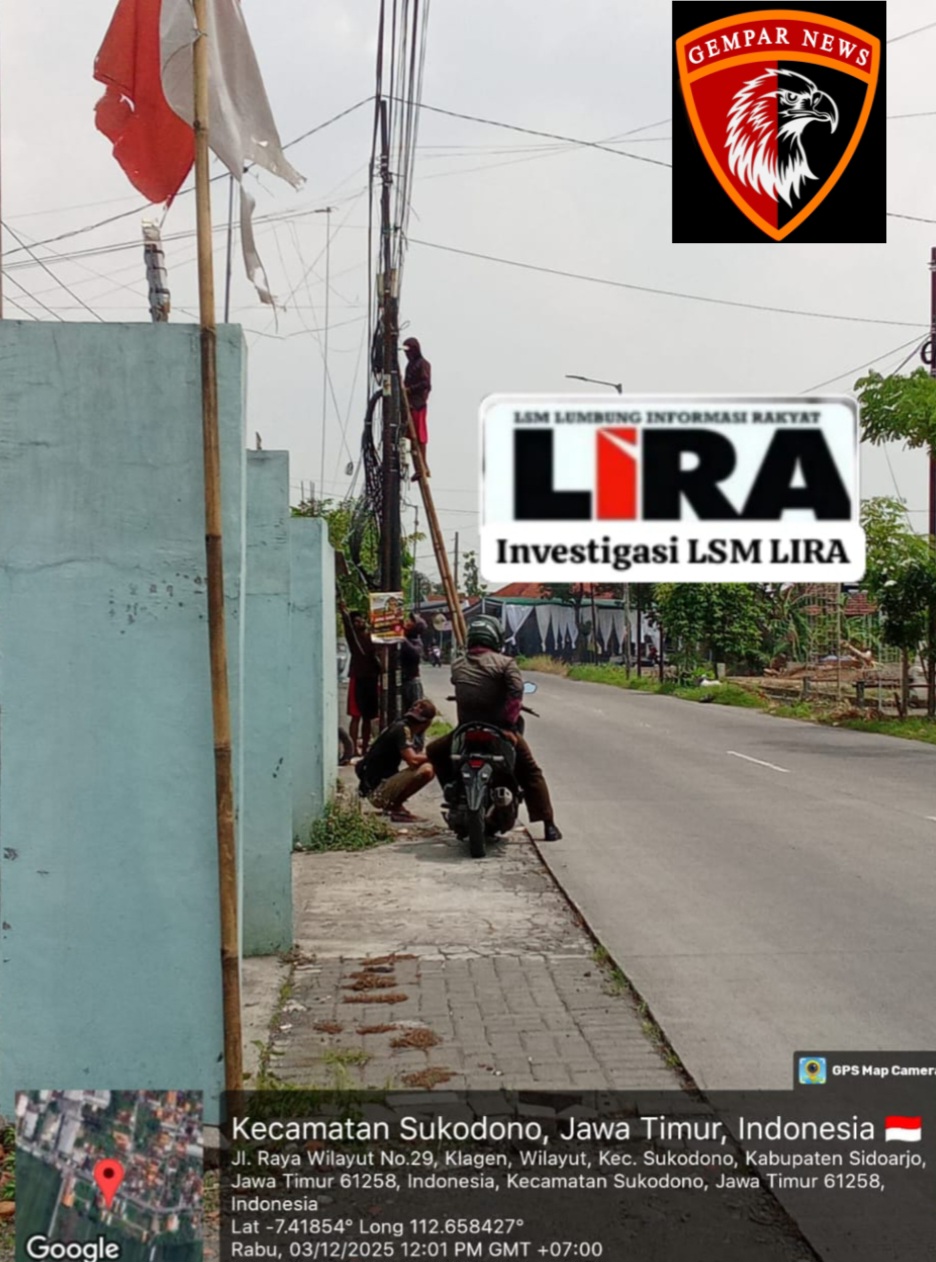 Sidoarjo – Kegiatan pemasangan jaringan kabel milik PT RPS yang menghubungkan tower ke tower di Jl. Wilayut, Desa Klagen, 3/12/2025 pukul 12:00 wib Kecamatan Sukodono, Sidoarjo menuai sorotan warga. Pekerjaan tersebut diduga dilakukan tanpa izin resmi dari Dinas Kominfo Kabupaten Sidoarjo, Dinas PUPR, serta tanpa persetujuan pemerintah desa dan RT/RW setempat.