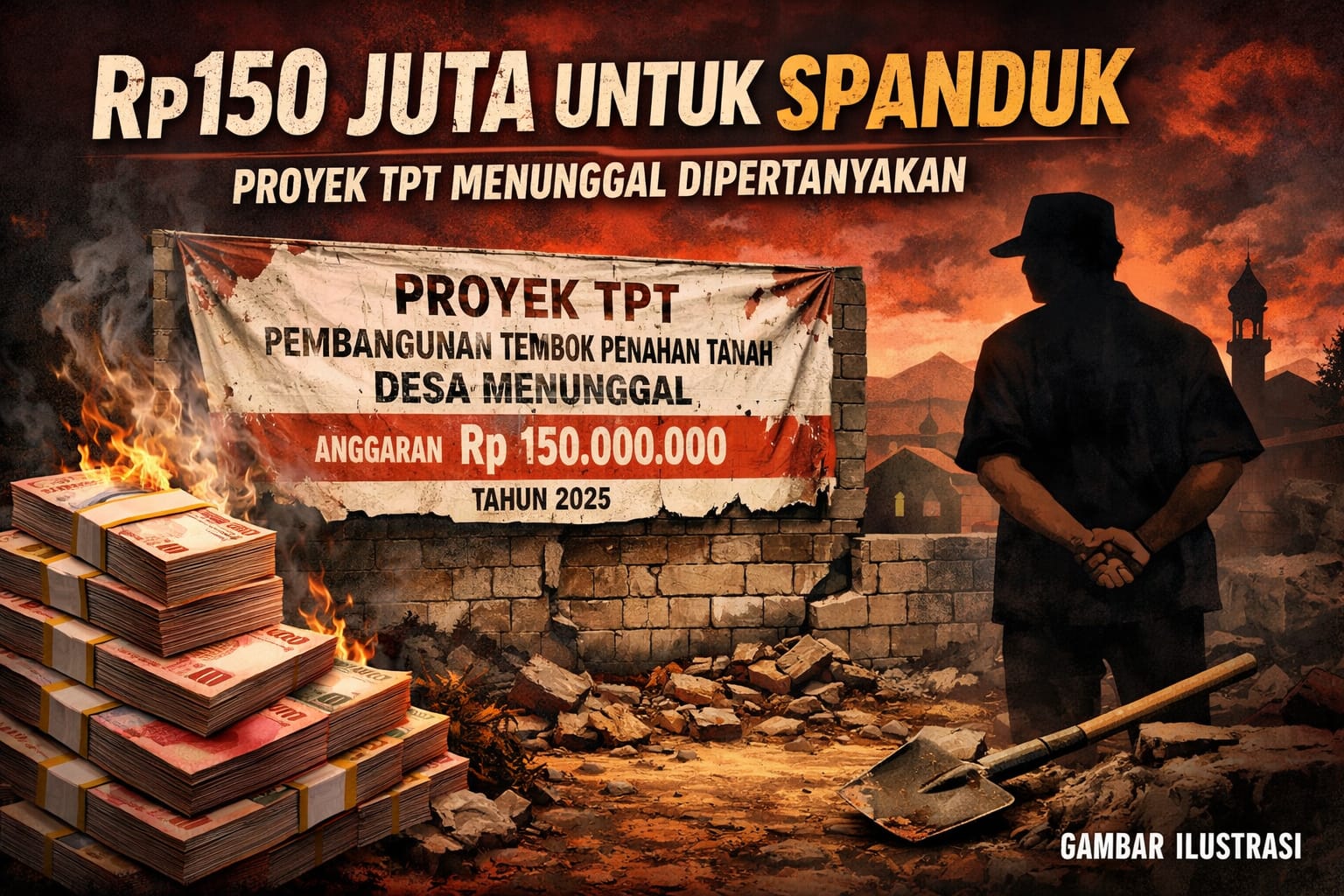 Gresik || Gempar News — Desa Menunggal hari ini tidak sedang membicarakan pembangunan, melainkan kecurigaan paling gelap dalam pengelolaan uang rakyat. Proyek Tembok Penahan Tanah (TPT) Tahun Anggaran 2025 senilai Rp150 juta di Dusun Kemuning diduga hanya hidup di atas kertas dan spanduk, sementara fisik bangunan tidak pernah lahir ke dunia nyata.