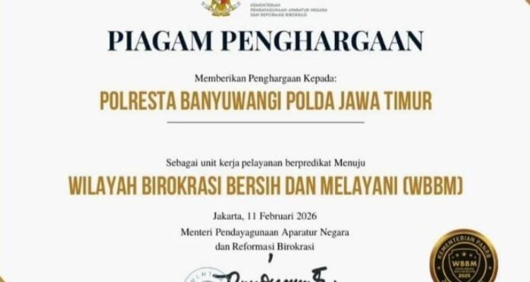 Polresta Banyuwangi Raih Penghargaan Zona Integritas Menuju WBBM Tahun 2025 BANYUWANGI